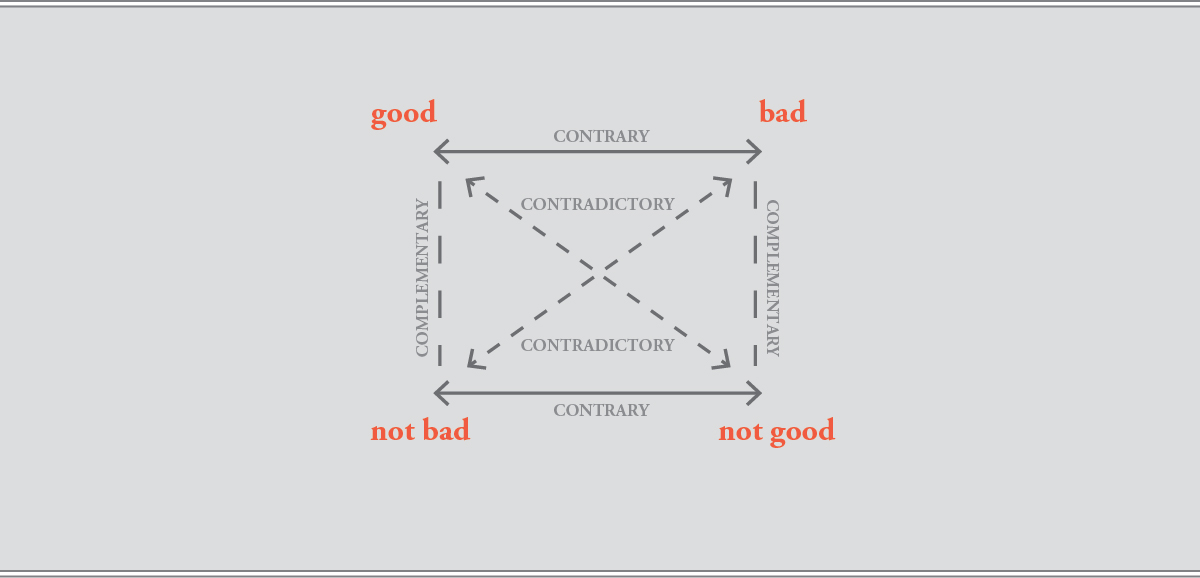 But meaning is not that simple. Something may be good or bad, but a situation may also be “not bad” instead of “bad”. Likewise a situation may be “not good” as opposed to “good”. These are relationships of contradiction and Greimas depicts this type of relationship along the diagonal axis of the square. Due to Greimas’ locations of the contrary and contradictory relationships, a third relationship emerges between the vertically opposed pairs in the square (such as a situation that is somewhere between “not bad”, and “good”). This is a complementary relationship [7].