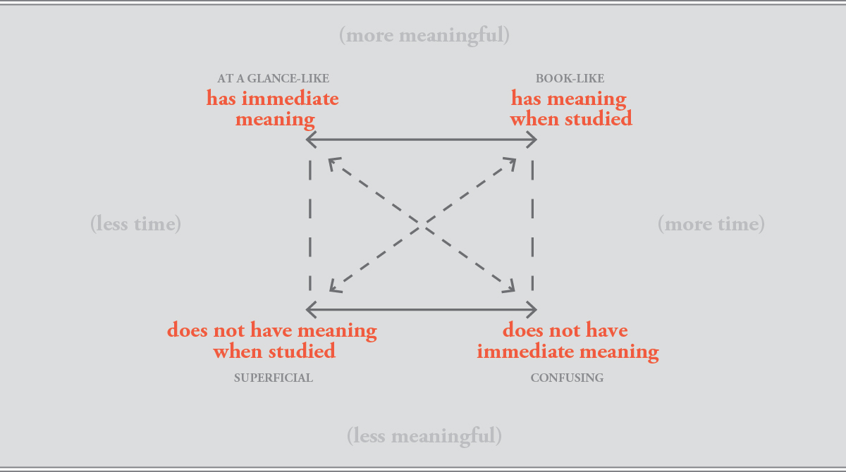 Here is a real-world example. The semiotic square shown above was developed to explore the effectiveness of corporate at a glance presentations. These presentations are often developed for annual reports or as stand alone presentations, where a quick understanding of a corporation’s structure or activities is required to understand the essence of the organization. An at a glance presentation must offer a high amount of meaningful content, but deliver its information quickly. In this way, it is a perfect design test subject, as it is, in a design sense, a visual environment under stress. The semiotic square, shown above, becomes an analytical tool we can use to understand, and rate the effectiveness of corporate at a glance presentations [8]. What we want to find, with this particular semiotic square, are at a glance presentations that tend toward the upper left area of the semiotic square. Various aspects of their designs may prove to be confusing, or they may be light on real content, proving to be superficial, or even full of content making them difficult to visually scan. Presentations that tend to the upper left, should be better at communicating quickly, and have more meaningful content.