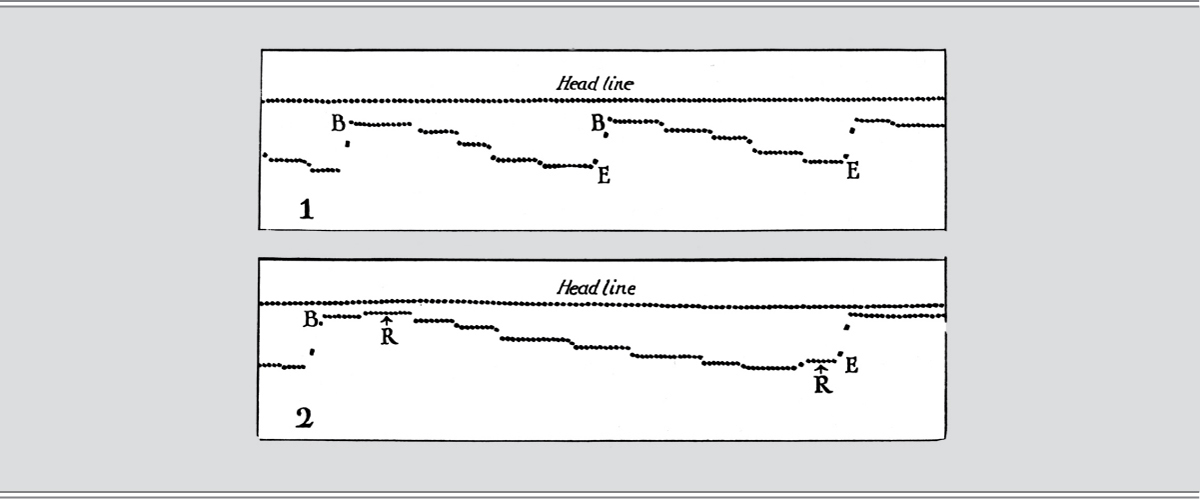 For over 30 years, the American psychologist Miles Tinker studied text legibility and performed many forms of reading tests, using various methods of research. One of Tinker’s main methods tested perception – how the visual channel behaves. Tinker’s research of eye movements and pauses when reading, is direct evidence of the physiological generation of channel noise. Tinker measured the frequency of eye fixations against reading speed for many different text layouts and found a correlation: more fixations means slower, more difficult reading, as shown in figure 3. Proper typesetting, type choice and type layout allows the reader to glance more easily, more efficiently, and less often [2].